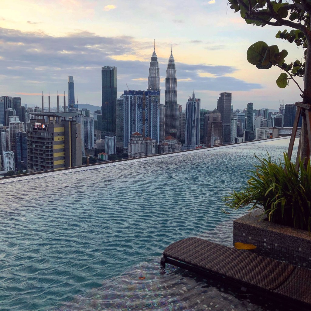Cestovala som iba s malým batohom, takže som hneď vyrazila na Petronas Twin Towers – najvyššiu dvojitú budovu na svete. Najprv som si budovu prehliadla z každého uhla. A nemohla som vynechať pohľad z vrchu a prechádzku po slávnom moste, ktorý tieto dva mrakodrapy spája. Vstupenky získate jednoducho vo vnútri nákupného centra, ktoré sa v budove nachádza, ale nie vždy sa dostanete na radu hneď. Ja som čakala asi hodinu. Vstupenky sa dajú rezervovať i na ich webe TU. Po prehliadke som si dala prechádzku na hotel Expressionz Professional Suites, ktorý patrí medzi najobľúbenejšie hotely v KL hlavne vďaka bazénu s výhľadom na Petronas Twin Towers.