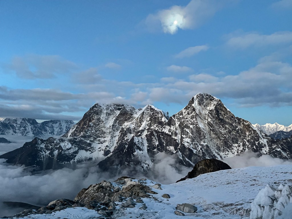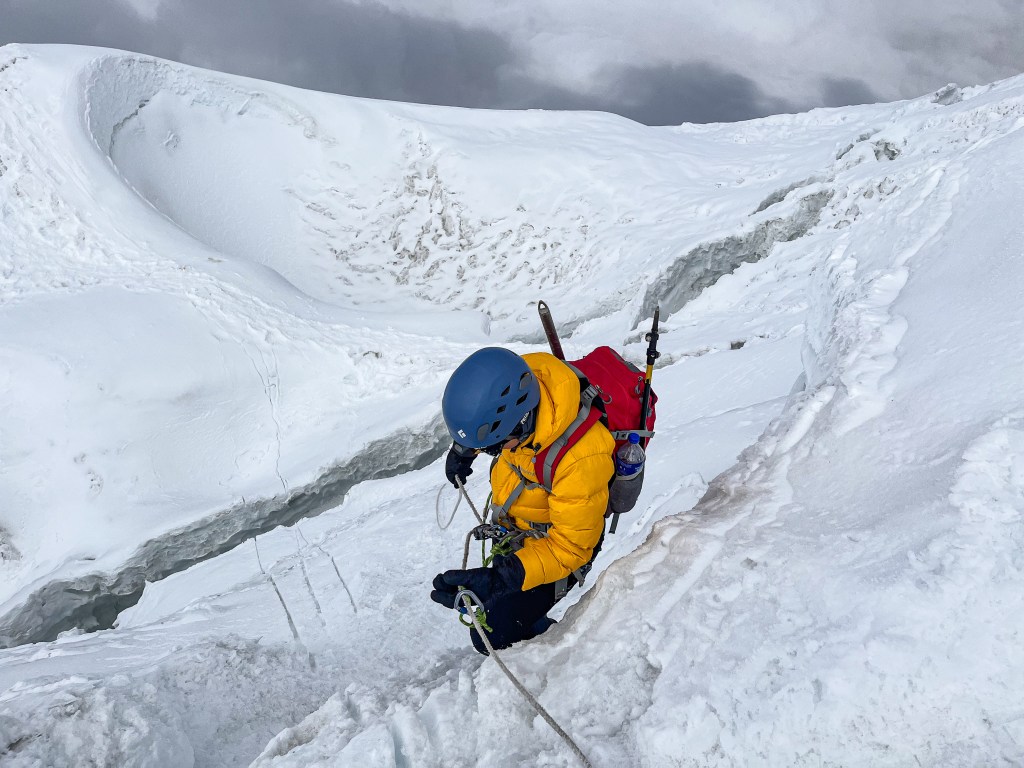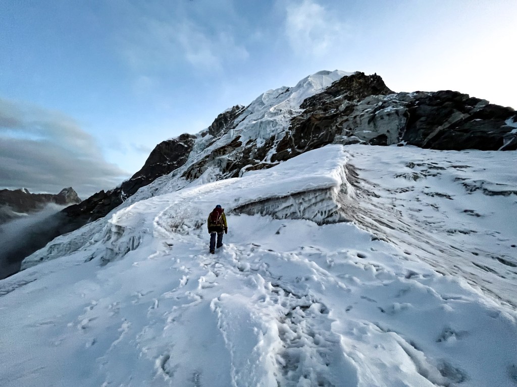 Budík sme si nastavili na 1:00 ráno. Najedli sme sa a okolo 2:15 sme vyrazili na vrchol. Stúpali sme najprv po kamennej cestičke, ktorou sme pred pár hodinami išli dole. Potom sme sa dostali na kamenné platne, ktoré som bola veľmi rada, že niesú zamrznuté. Mesiac svietil, bola krásna jasná noc. Pred svitaním som pomaly začínala vidiet hory okolo seba. Dostali sme sa na ľadovec, kde sme si obuli mačky, navliekli si sedák a dali si krátku prestávku. Teraz začne tá technickejšia časť. Po chvíle kráčania po ľadovci sa dostávame k zľadovatelej skale. Lezenie pomocou fixného lana a jumaru (pomôcka, pomocou ktorej sa zachytíš na lano a nespadneš) sa zdá byť pomerne jednoduché, vadí mi len chodiť v mačkách na skale, hovorím si v hlave. Znovu sa dostávame na ľadovec a ja si myslím, že už vidím vrchol. Ale nie! Vrchol je až za tým! Začína vyliezať slnko a hory okolo sa dokonalo odkrývajú. To, že vidím vrchol si myslím asi 3x a vždy príde sklamanie.