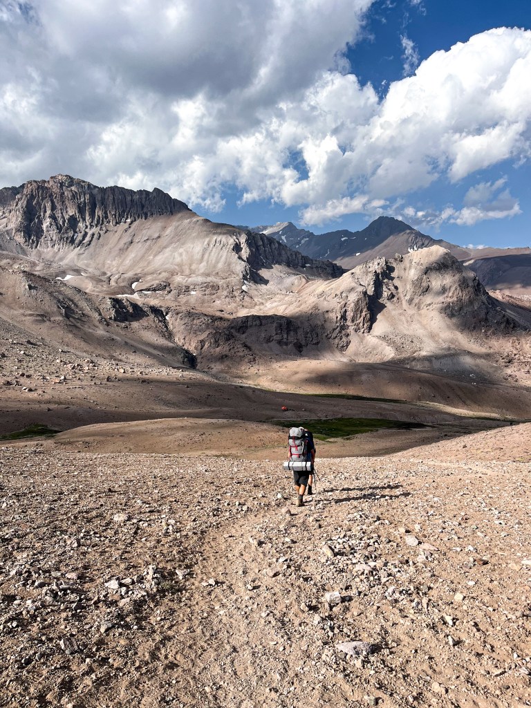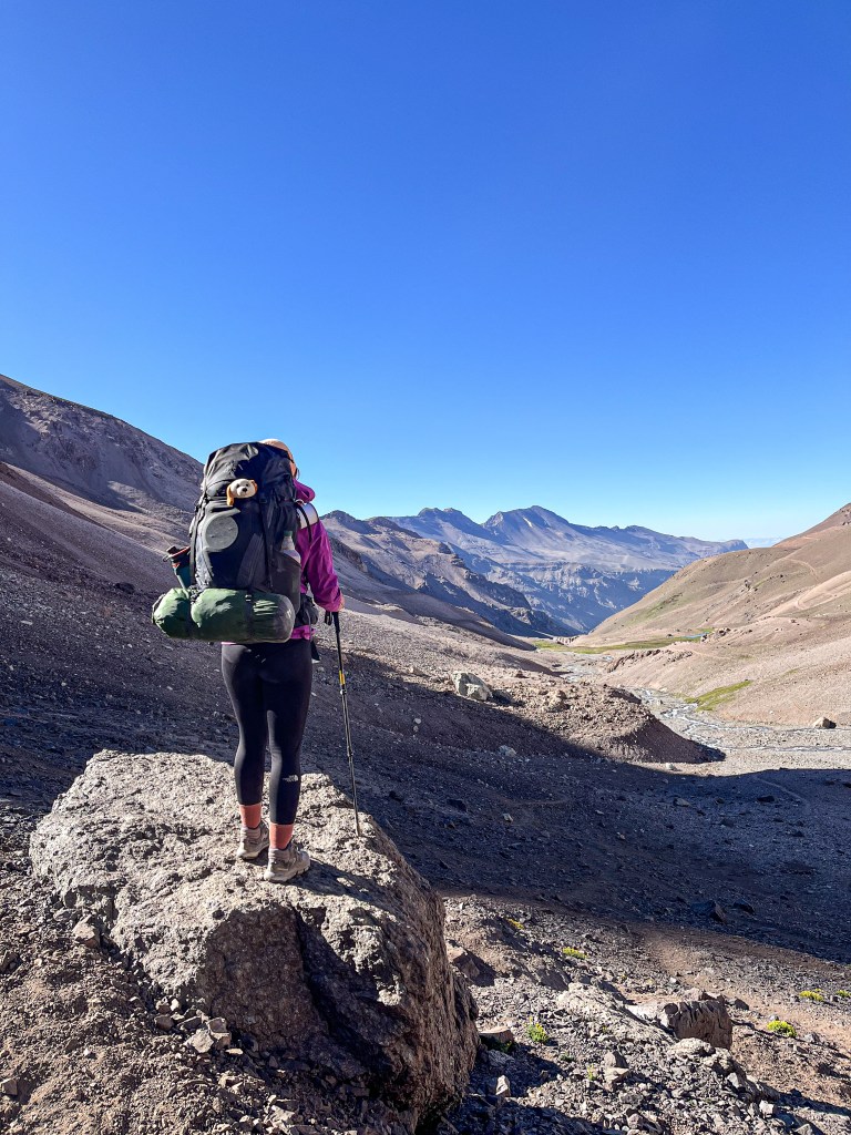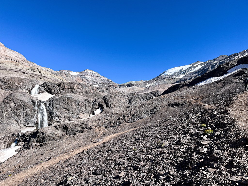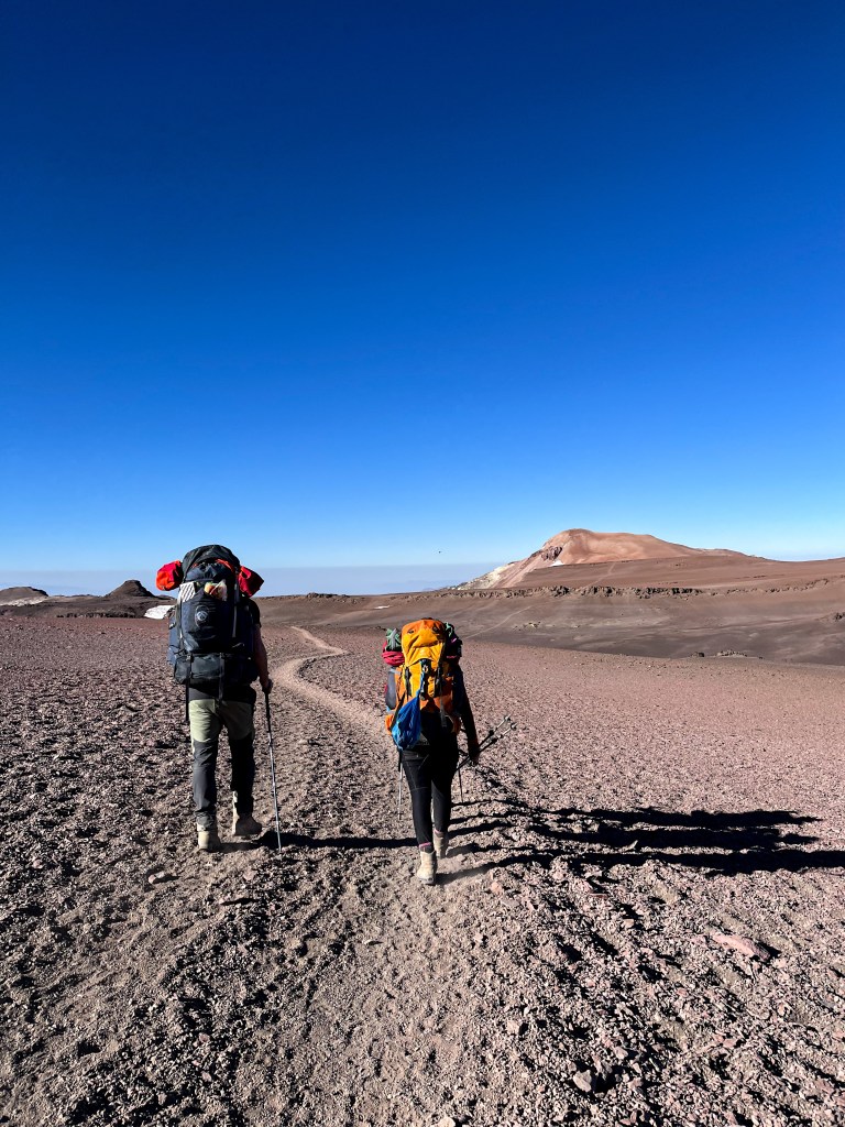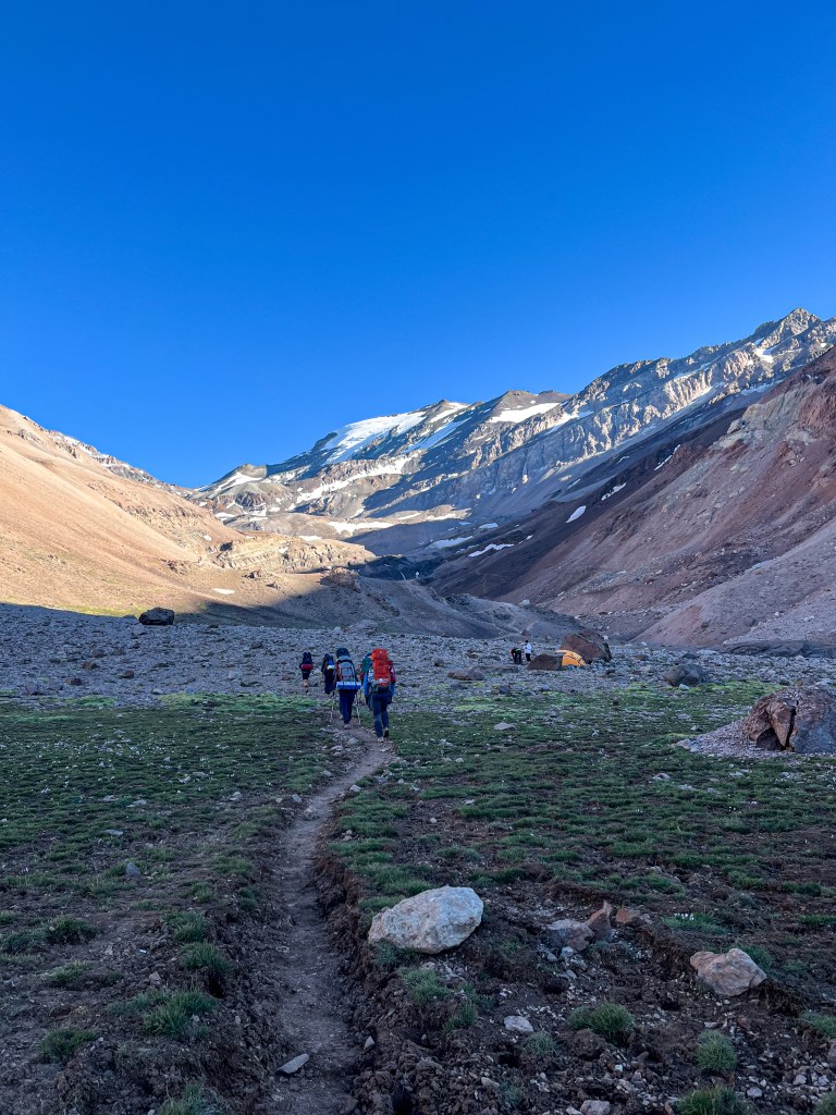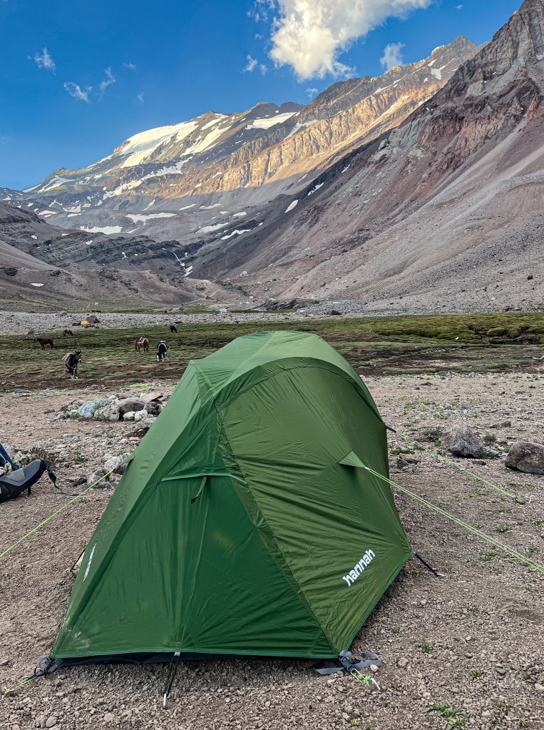 Druhý deň sme ráno ešte dokúpili zásoby, požičali autá, po ceste sa zastavili na obed a poobede sme dorazili k lanovkám pri mestečku La Parva. Stihli sme akurát poslednú, ktorá nám pomohla zdolať prvých pár výškových metrov. Pred 17h sme začali šlapať do nášho prvého kempu, ktorý sa nachádzal pri riečke Estero del Cepo. Tri hodiny sme išli do kopca a z kopca a tesne pred západom slnka sme dorazili na miesto. Kemp vo výške 3500 m bol ako jediný zelený, inak viedla cesta po suchej pustine s lár lagúnami a zeleňou iba pri potôčikoch. Rýchlo rozložiť stan, prevariť vodu z riečky, dať si večeru a miestne pivo, na ktoré samozrejme muselo výjsť miesto v batohu a mohli sme ísť spať.