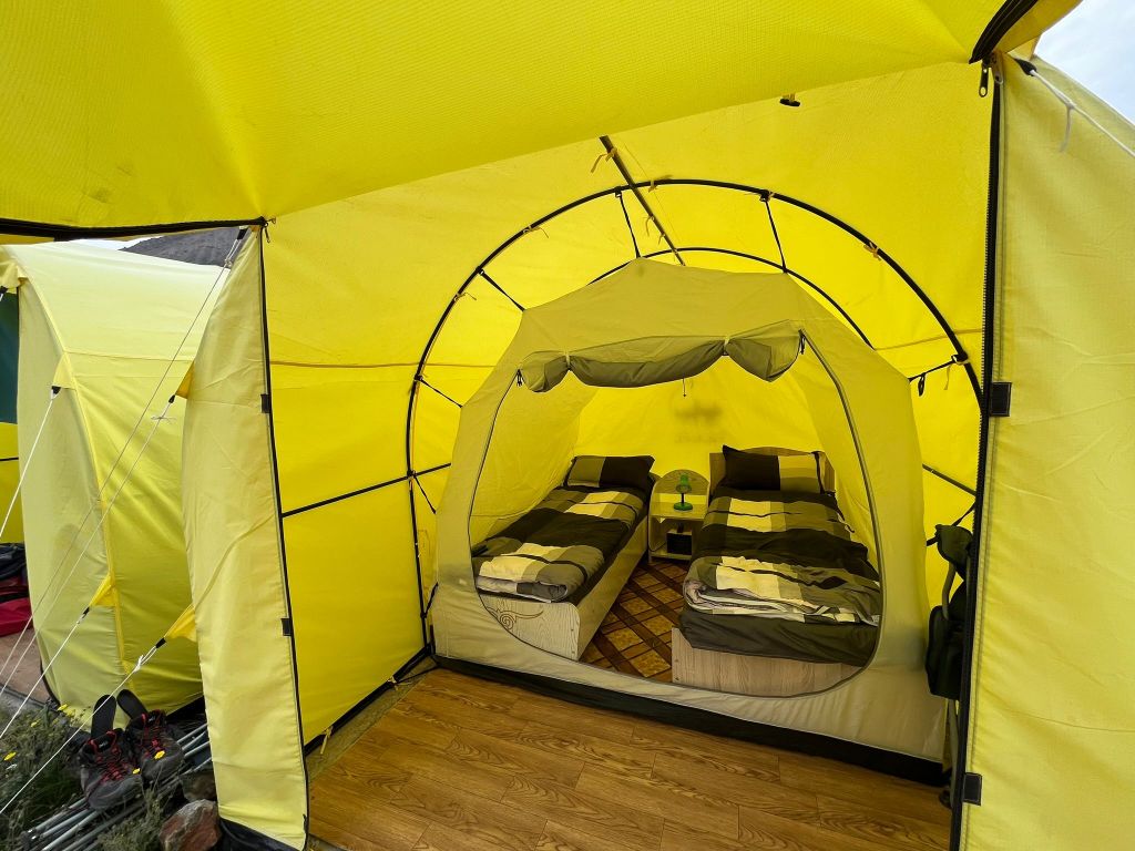 Na konci júla 2024 prilietame s kamošom Milanom do Uzbekistánu a premiestňujeme sa do základného tábora (BC) v Kyrgyzstáne. BC je v nadmorskej výške 3 600 m a vyzerá ako jedna malá dedinka. Stany priestranné, v nich postele s vankúšmi a perinami, nočný stôl, lampička, elektrika a ohrievač. Teplé sprchy po celý deň, normálne (turecké) záchody, sauna, obchod s jedlom a požičovňa s expedičnou výbavou, 4-chodové jedlo 3x denne. Kemp je umiestnený na rozkvitnutej lúke s nádherným výhľadom na Lenin Peak. Prvý deň sa zoznamujeme s ostatnými piatimi členmi skupinky z Poľska a Švajčiarska a s našimi tromi nepálskymi šerpami.