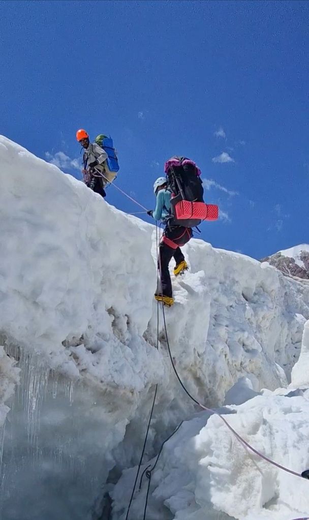 Dostaneme sa k ľadovej kolmej stene, kde sa znovu tvorí fronta. Teraz je to ale taká príjemná fronta, kedy sú všetci radi, že si na chvíľku oddýchnu. V tom čakaní mi mrznú prsty na nohách a na rukách. Kopem do snehu, hýbem s prstami čo to len ide. Vidím, že začína vychádzať slnko a tak aj nádej, že sa čoskoro oteplí. Nad kolmou ľadovou stenou sa odviažeme a každý pokračuje podľa svojho tempa. Jeden šerpa ide prvý, jeden posledný a my medzi nimi. Každý buď rýchlejšie alebo pomalšie postupuje hore. Milan je predo mnou, ja si udržiavam svoje slimačie tempo, ktoré v týchto výškach je potreba dodržiavať. Platí tu pravidlo „Pomaly ďalej zájdeš“. Vyššia nadmorská výška sa podpisuje na výkonnosti, na dýchaní. Človek si myslí, že už nemôže, ale často je ešte v ňom veľa energie. Pociťujem veľkú krízu, potrebujem si sadnúť, niečoho málo sa najesť. Cítim, že už vôbec nemám energiu a že moje telo protestuje. Rozmýšľam, že to otočím. Po pár minútach pauzy ale idem ďalej, tempo nasadím ešte pomalšie.